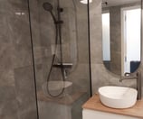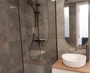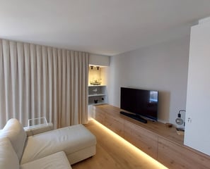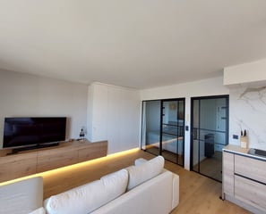 De studio is geschikt voor 3 volwassenen of 2 volwassenen en 1 kind. Je vindt er alles wat je nodig hebt voor een comfortabel verblijf: een volledig uitgeruste keuken, voldoende opbergruimte, en een badkamer met een luxe regendouche.
